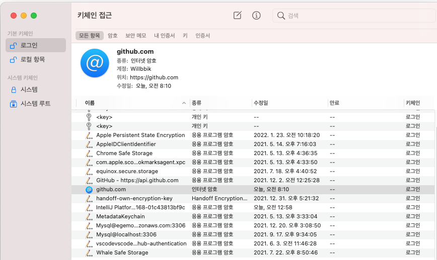 1. 키체인의 로그인에 들어가줍니다.